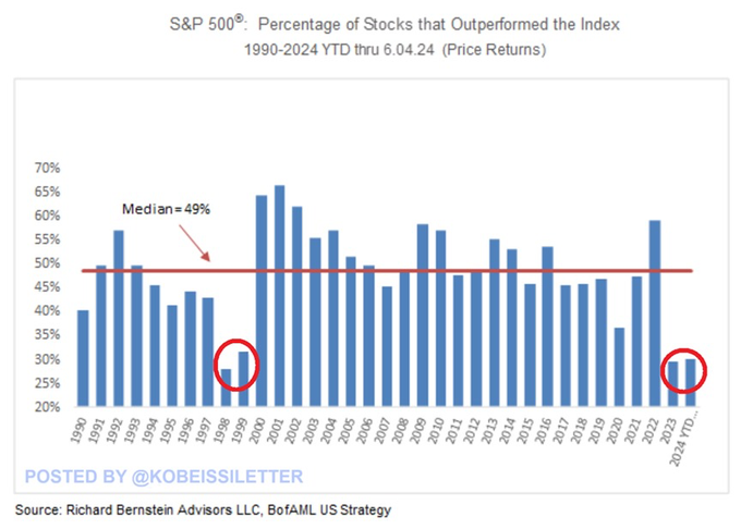 财联社6月17日电,今年迄今,标普500指数中仅有30%的成分股表现优于大盘,这一比例略高于2023年的29%。根据历史统计,自1990年以来,只有在2000年互联网泡沫期间才出现过连续两年相关比例如此低的情况。相比之下,历史中值为49%,这一数字通常意味着健康的市场广度。毫无疑问,在标普500指数年内上涨12%背后,主要受到了少数大型科技股的推动。而少数股票对整个市场的深远影响,也意味着眼下择股对于美股投资收益正变得愈发关键。