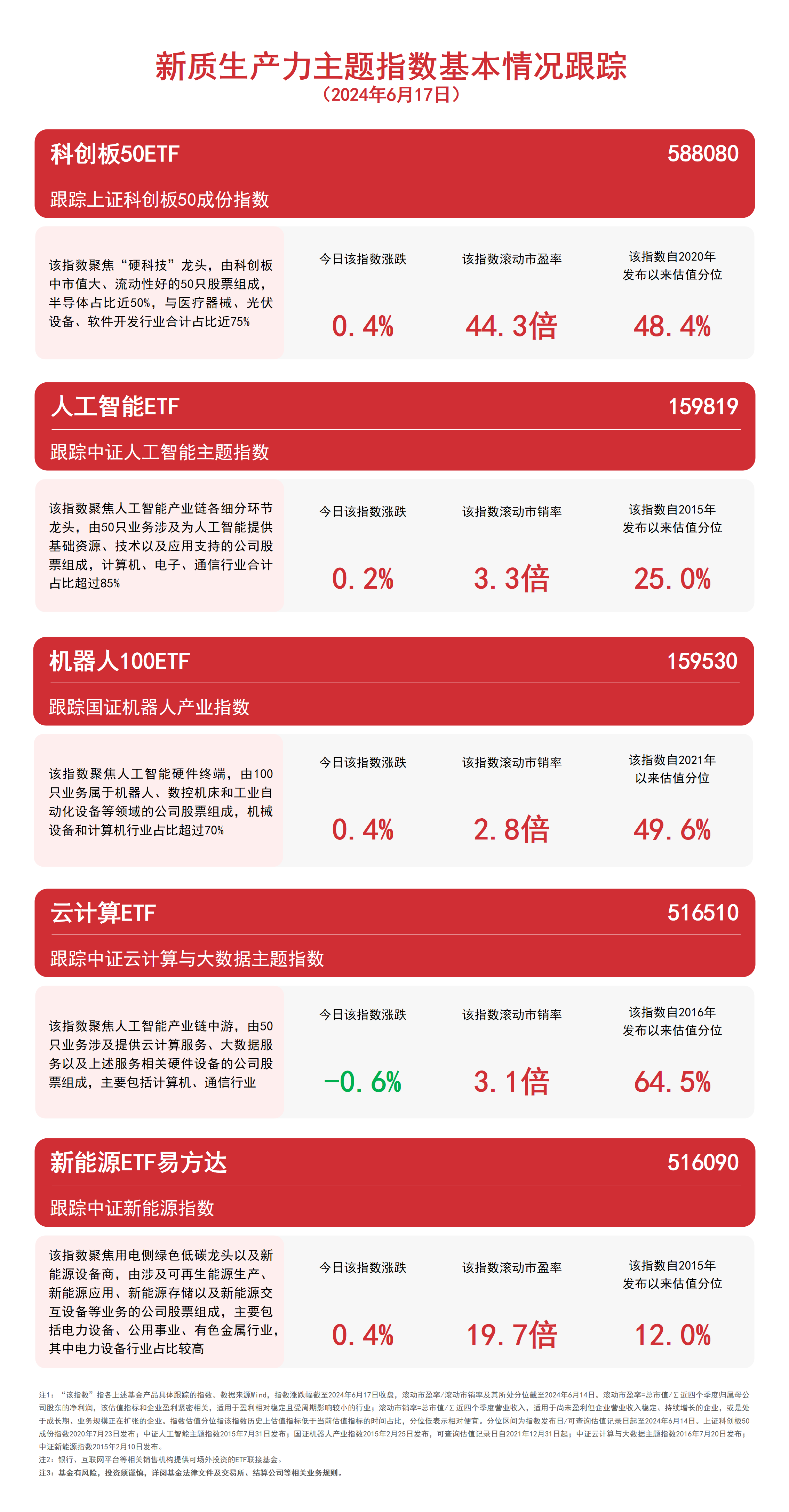 截至收盘,今日上证科创板50成份指数上涨0.4%,国证机器人产业指数上涨0.4%,中证新能源指数上涨0.4%,中证人工智能主题指数上涨0.2%,中证云计算与大数据主题指数下跌0.6%。