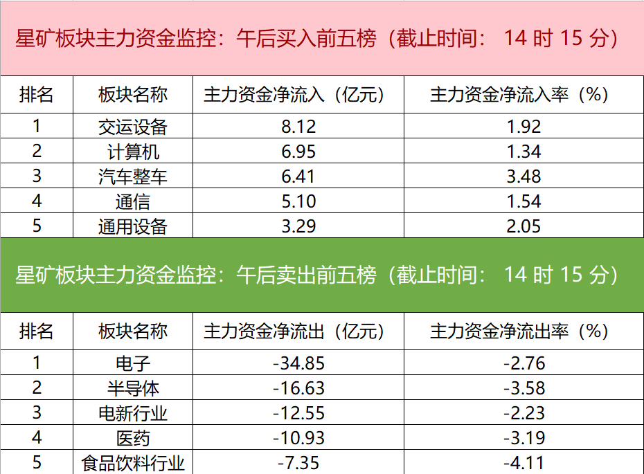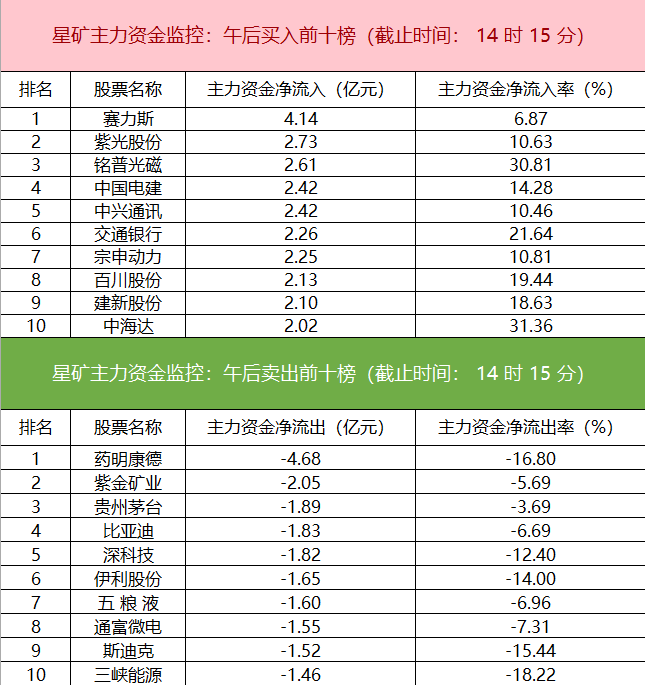 财联社6月18日电,财联社星矿数据显示,今日主力资金净流入交运设备、计算机、汽车整车等板块,净流出电子、半导体、电新行业等板块,其中电子板块净流出34.85亿元。个股方面,赛力斯大涨,主力资金净买入4.14亿元居首位,紫光股份、铭普光磁、中国电建获主力资金净流入居前;药明康德遭净卖出4.68亿元居净流出首位,紫金矿业、贵州茅台、比亚迪等主力资金净流出额居前。