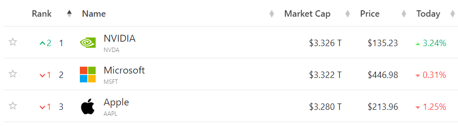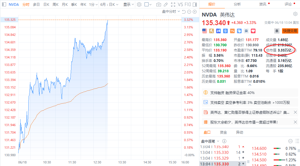 财联社6月19日电,英伟达日内涨超3%,总市值3.33万亿美元,超过微软、苹果,成为全球最高市值股票。