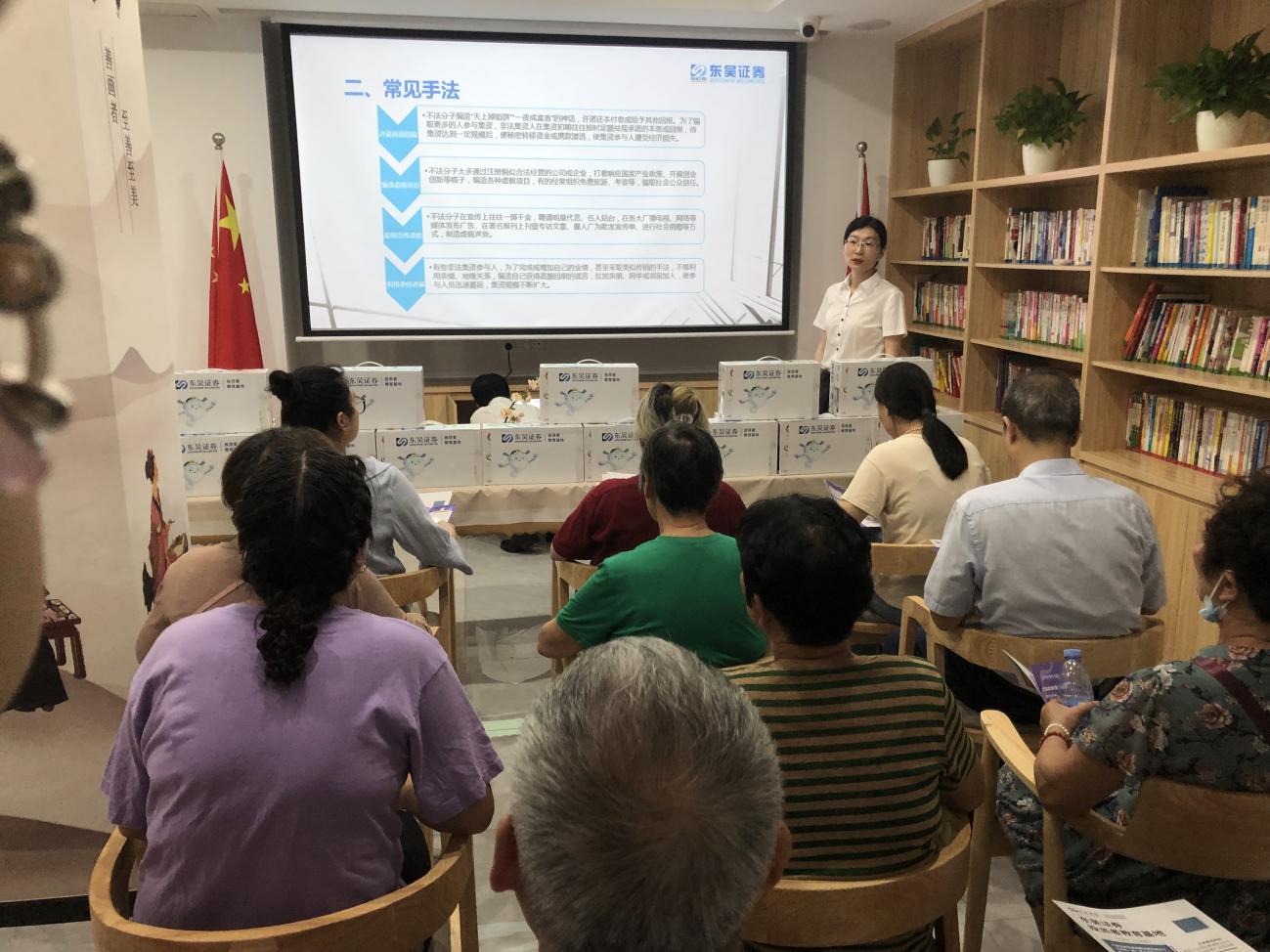 随后,营业部合规专员杨颖老师开展了以《防范非法证券活动》为主题的宣讲。通过讲解非法证券活动的定义、主要套路、案例和防范措施,杨老师向社区居民进行风险教育,引导其识别和防范非法证券活动,普及投资者适当性管理相关法律法规和基础知识,传导理性投资、价值投资、长期投资理念。