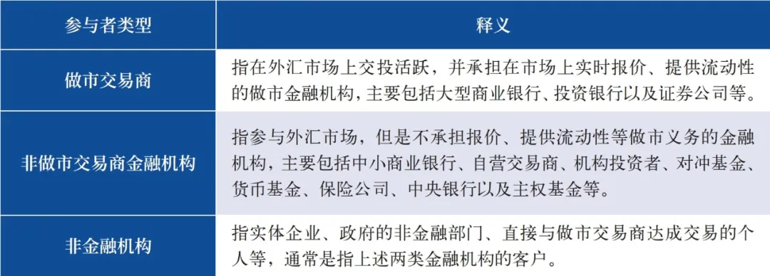 外汇市场的参与者一般可以分为三个层次:做市交易商、非做市交易商金融机构与非金融机构。