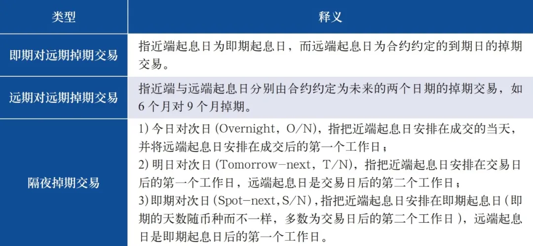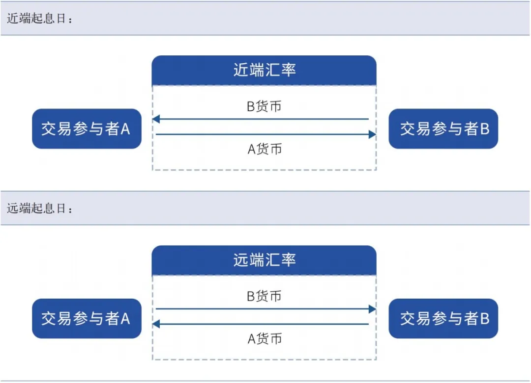 外汇掉期交易中,交易双方约定在一前一后两个不同的起息日进行方向相反的两次货币交换。每笔外汇掉期交易都包含一个近端期限和一个远端期限,分别用于确定近端起息日和远端起息日,两个期限可以是标准期限(例如,1个月,1年),也可以是非标准期限。
