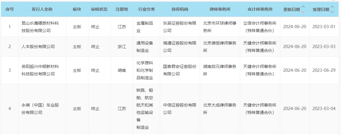 财联社6月20日电,上交所终止对长鹰硬科、人本股份、中顺新科、永祺车业四家公司IPO审核,因上述四家公司及其保荐人撤回发行上市申请。