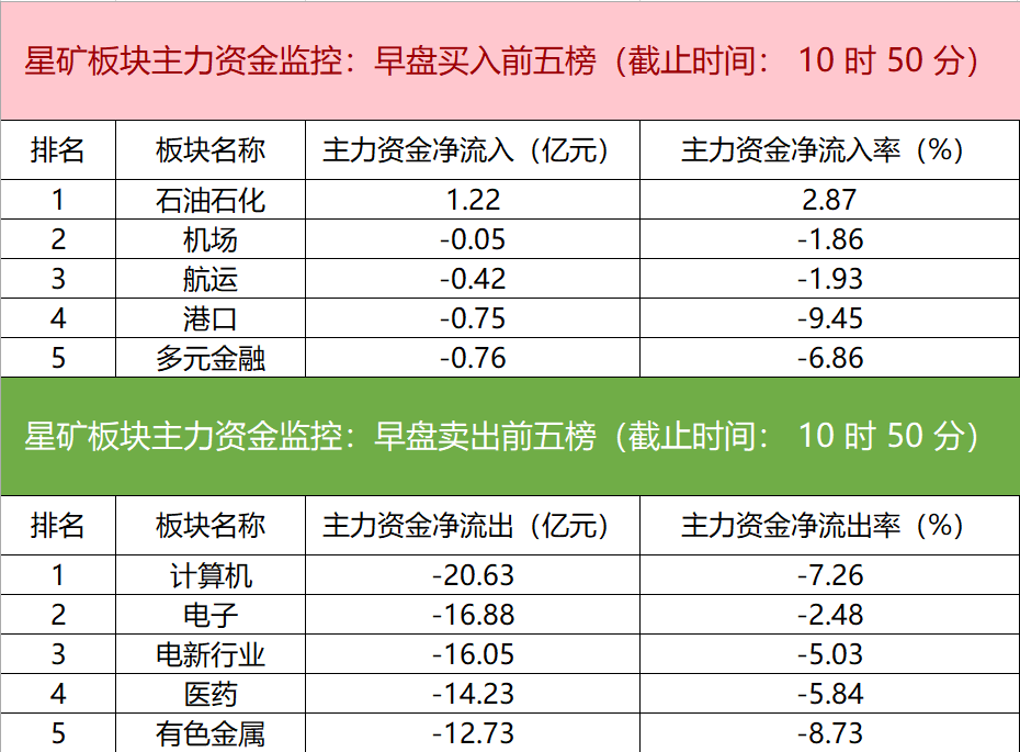 财联社6月24日电,财联社星矿数据显示,今日早盘主力资金仅净流入石油石化板块,净流出计算机、电子、电新行业等板块,其中计算机板块净流出超20亿元。个股方面,科翔股份涨停,主力资金净买入1.94亿元位居首位,西昌电力、中国海油、比亚迪获主力资金净流入居前;赛力斯遭净卖出超3亿元,天孚通信、软通动力、长江电力主力资金净流出额居前。