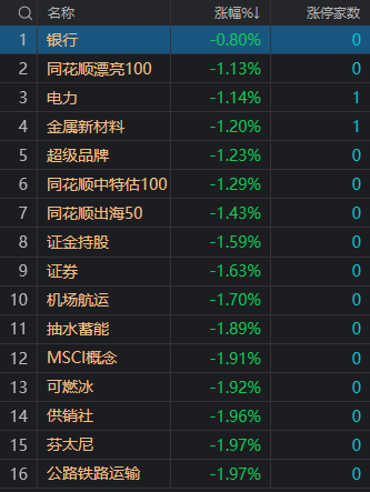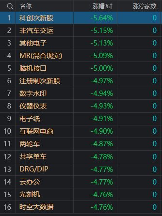 财联社6月24日电,市场全天低开低走,三大指数均跌超1%。指数黄白分时线明显分化,中小盘股普跌。沪深两市今日成交额6956亿,较上个交易日放量760亿。盘面上,电力股开盘拉升,西昌电力涨停。PCB概念股局部活跃,科翔股份、天津普林、博敏电子、景旺电子涨停。数字货币概念股午后异动,兆日科技、飞天诚信、御银股份涨停。下跌方面,科创板次新股集体调整,锴威特跌超10%。总体上个股跌多涨少,全市场近5000只个股下跌。板块方面,无一板块上涨,科创板次新、MR、脑机接口、电商等板块跌幅居前。截至收盘,沪指跌1.17%,深成指跌1.55%,创业板指跌1.39%。