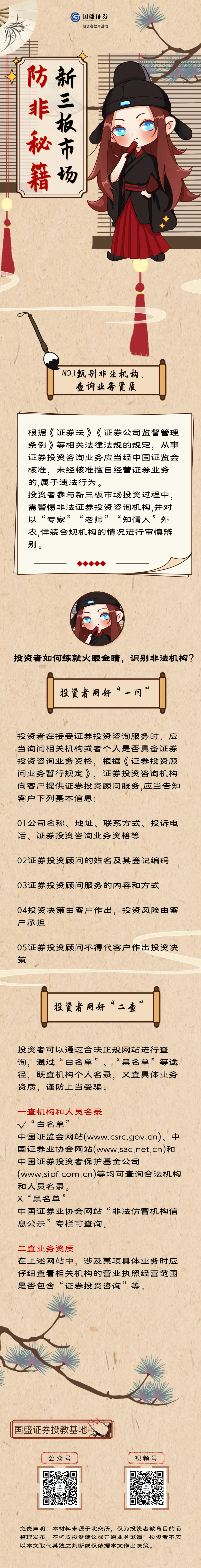 编者按:为保护投资者合法权益,国盛证券投资者教育基地制作了《新三板市场防非秘籍》系列图文,提醒广大投资者甄别非法证券投资咨询机构,合规参与市场,有效识别风险,谨慎开展投资,点击下方图文一起来学习吧!