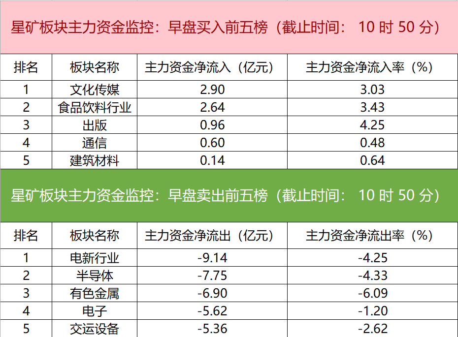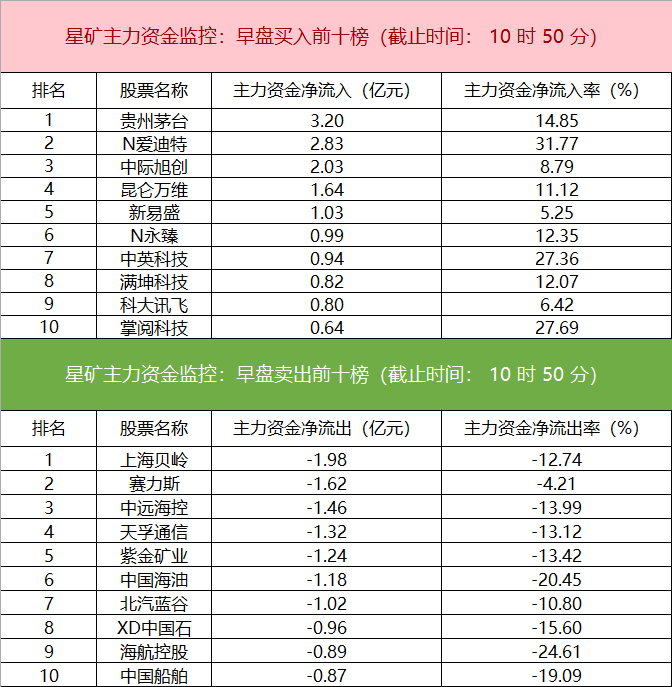 财联社6月26日电,财联社星矿数据显示,今日早盘主力资金净流入文化传媒、食品饮料行业、出版等板块,净流出电新行业、半导体、有色金属等板块,其中电新行业净流出超9亿元。个股方面,贵州茅台上涨,主力资金净买入3.20亿元位居首位,N爱迪特、中际旭创、昆仑万维获主力资金净流入居前;上海贝岭遭净卖出超1亿元,赛力斯、中远海控、天孚通信主力资金净流出额居前。