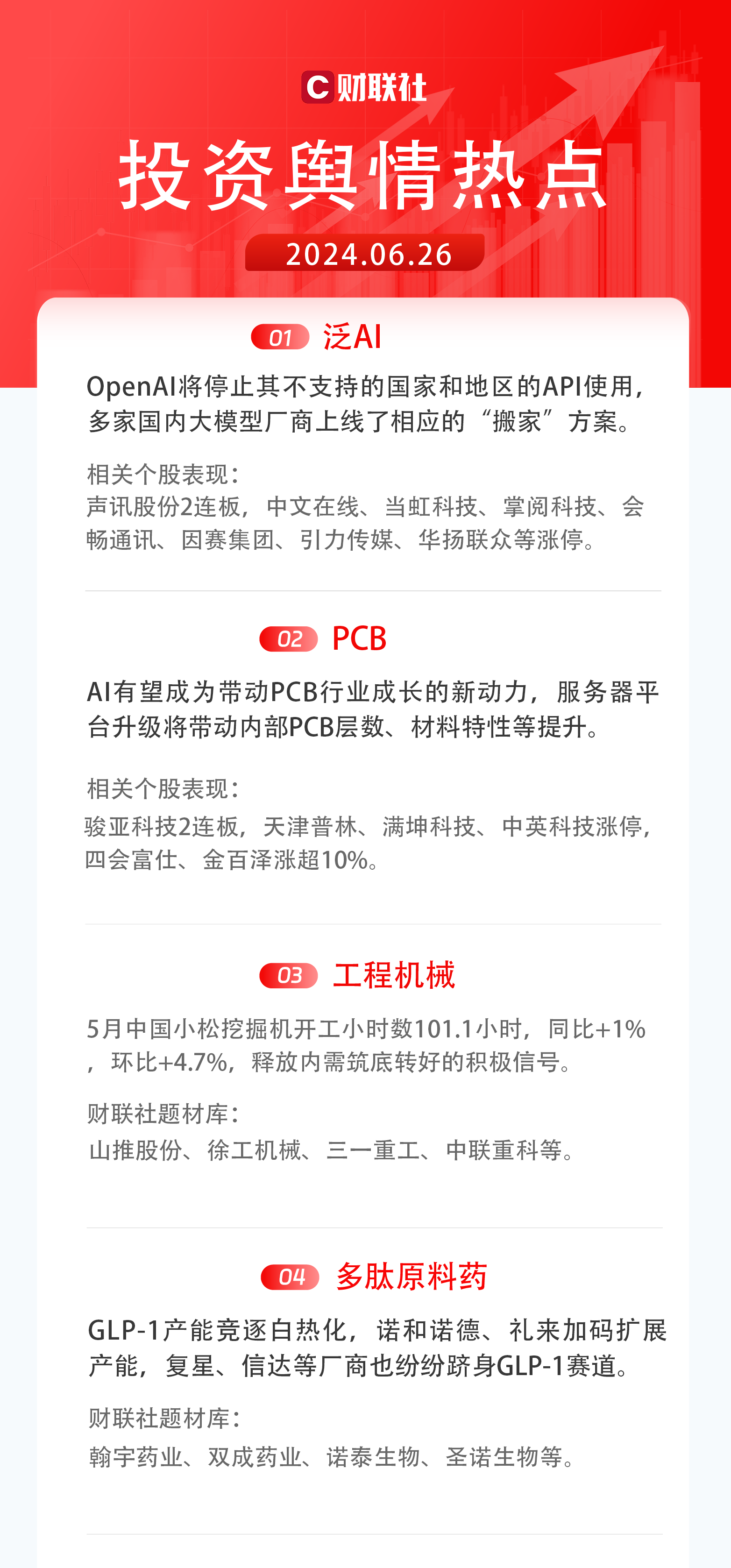 1)泛AI:OpenAI将停止其不支持的国家和地区的API使用,多家国内大模型厂商上线了相应的“搬家”方案。