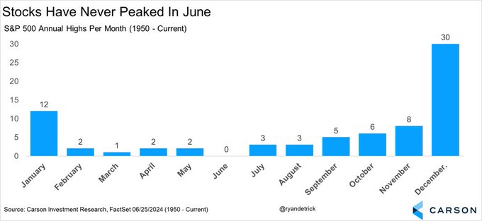 财联社6月26日电,在标普500指数上周升破5500点后,美股的牛市到头了吗?一个神奇规律似乎可以给多头吃下一颗“定心丸”:自从1950年以来,标普500指数的历年峰值,从来就不曾出现在6月。如果这一神奇规律能够在今年继续延续,那么无论标普500指数本月最终能涨到多高,下半年都还有机会进一步打破高位纪录。