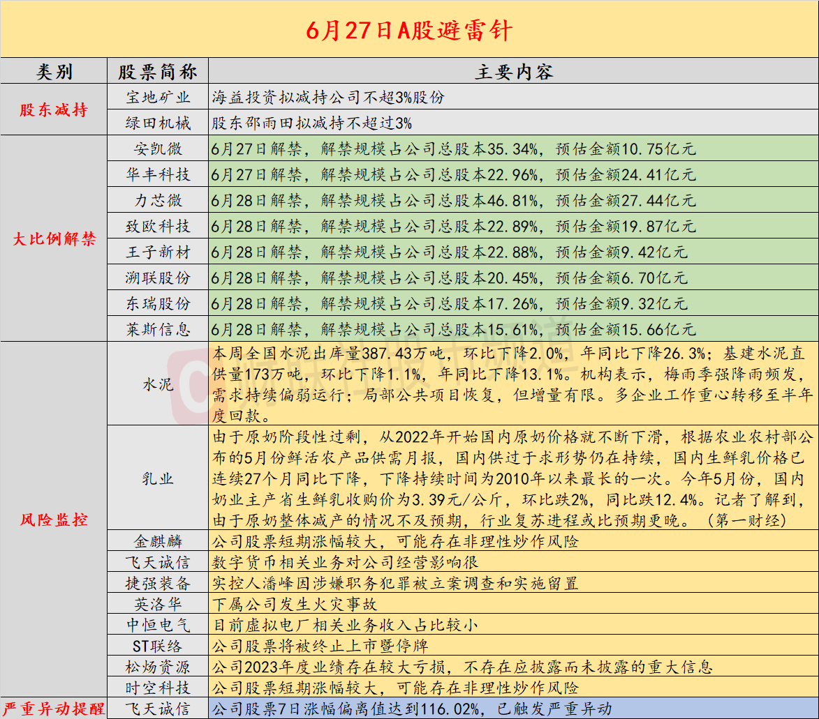昨日公告的A股拟减持的公司数量较之前有所减少,宝地矿业股东海益投资拟减持公司不超3%股份,绿田机械股东邵雨田拟减持不超过3%;华丰科技、安凯微将迎来超二成以上解禁;近期黄金销量下滑,深圳水贝黄金加工厂减产、部分企业直接停工放假;5连板金麒麟公告,公司股票短期涨幅较大,可能存在非理性炒作风险;牛奶收购价连续27个月同比下跌,行业复苏进程面临推迟;4连板飞天诚信提示风险,数字货币相关业务对公司经营影响很小;指引不及预期,美光股价盘后下跌近8%。