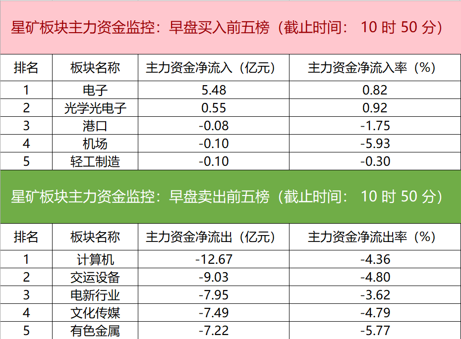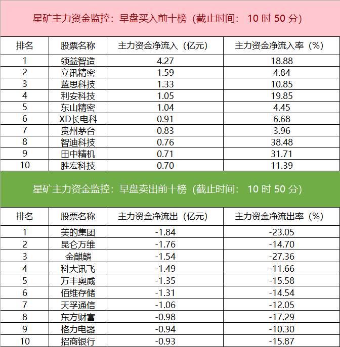 财联社6月27日电,财联社星矿数据显示,今日早盘主力资金仅净流入电子和光学光电子板块,净流出计算机、交运设备、电新行业等板块,其中计算机板块净流出超12亿元。个股方面,领益智造涨停,主力资金净买入4.27亿元位居首位,立讯精密、蓝思科技、利安科技获主力资金净流入居前;美的集团遭净卖出超1亿元,昆仑万维、金麒麟、科大讯飞主力资金净流出额居前。