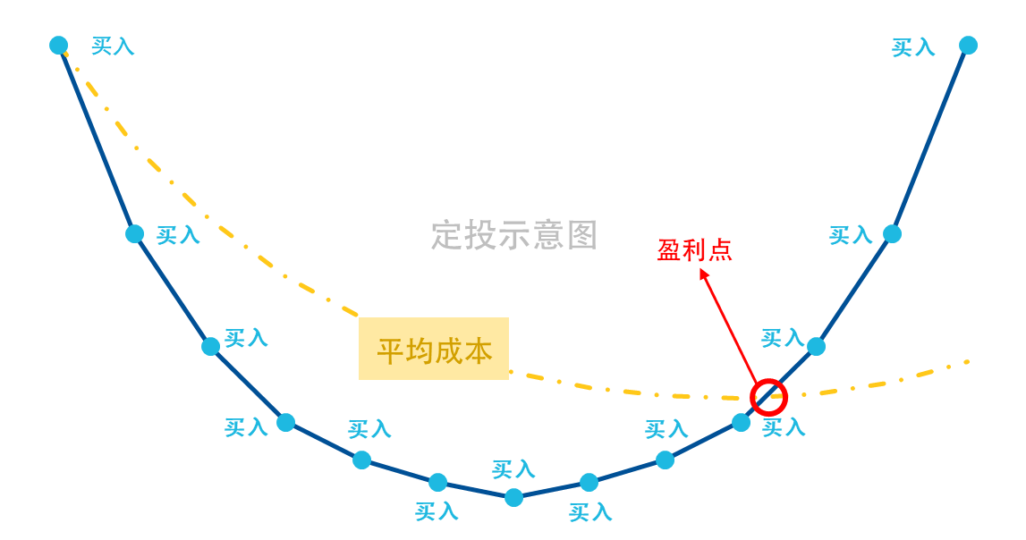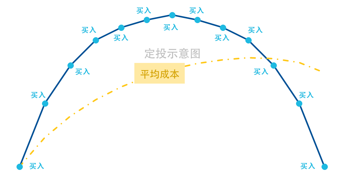在“苦笑曲线”中,前半段每次买入成本逐级上升,定投平均成本也随之渐高;后半段遇到市场下跌,定投累计收益由盈转亏,与微笑相对,形似“倒U”型的苦笑。大致情况如下图所示: