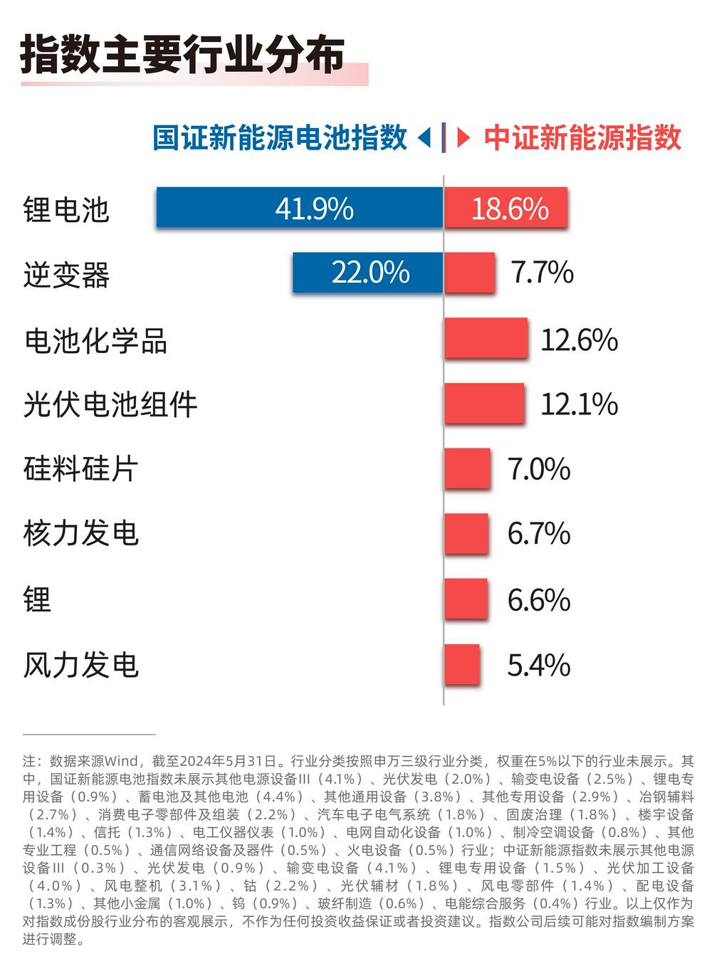国证新能源电池指数聚焦储能产业链,是纯正的储能主题指数,锂电池为第一大权重行业、占比超40%;中证新能源指数聚焦新能源用电侧和设备商,前三大权重行业锂电池、电池化学品、光伏电池组件合计占比超40%。储能电池ETF(159566)、新能源ETF易方达(516090)等产品,可助力投资者便捷布局板块龙头。