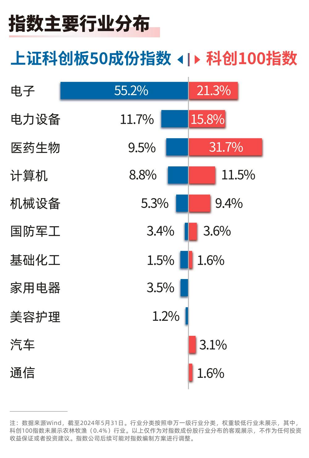 从申万一级行业来看,上证科创板50成份指数前三大权重行业分别为电子、电力设备、计算机,其中,电子行业占比过半;科创100指数前三大权重行业分别为医药生物、电子、电力设备,合计占比近70%。
