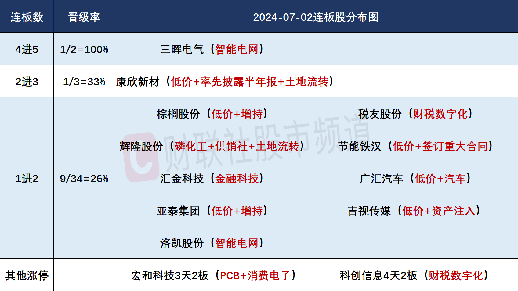 今日共50股涨停,连板股总数11只,上一交易日共39只个股涨停,涨停股晋级率28.20%(不含ST股、退市股及未开板新股)。个股方面,低价股、微盘股大幅反弹,今日50只涨停个股中有27只个股股价不足6元。连板方面,三晖电气一字涨停晋级5连板, 税友股份同样一字涨停录得6天5板,不过值得注意的是,继金麒麟、时空科技之后,瀛通通讯(昨4连板)午后跌停,连板龙头遭“闷杀”的情况还在继续,表明市场风偏仍旧低迷。板块方面,财税数字化概念爆发,并带动数字政务、金融科技的细分集体上涨,汇金科技、科创信息、普联软件等7只个股20CM涨停,东方财富研报表示,新一轮财税体制改革有望带动新一轮财税信息系统建设,以科技手段为财税合规提供基础设施,推动数字经济健康有序发展;银行板块连涨6天,工农中建四大行趋势强劲,央行昨日公告,决定于近期面向部分公开市场业务一级交易商开展国债借入操作,此举或导致长短端利差扩张,有利于银行降低不良拨备,释放利润。