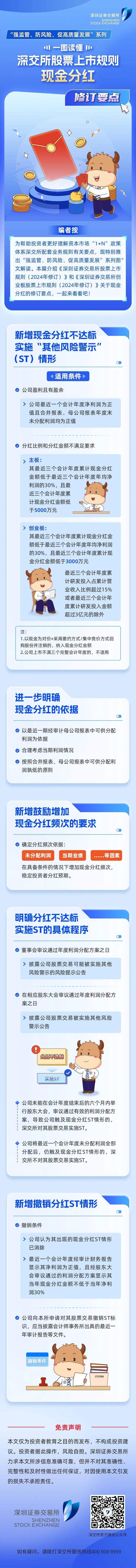 为帮助投资者更好理解资本市场“1+N”政策体系深交所配套业务规则有关要点,深交所特别推出“强监管、防风险、促高质量发展”系列图文解读。本篇介绍《深圳证券交易所股票上市规则(2024年修订)》和《深圳证券交易所创业板股票上市规则(2024年修订)》关于现金分红的修订要点,一起来看看吧!