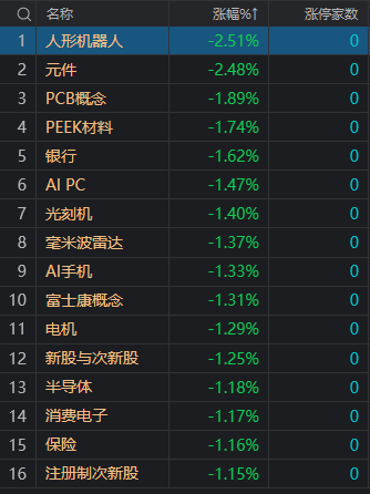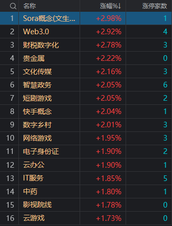 财联社7月5日电,市场早盘延续调整,沪指领跌。盘面上,AI应用方向展开反弹,Sora概念股领涨,福石控股、佳云科技、天地在线涨停。财税数字化、软件股再度走强,天玑科技、任子行、通达海、飞利信均20CM涨停。中药股盘中拉升,长药控股4天3板。下跌方面,红利股集体调整,交通银行、中国海油、中国神华等多股跌超2%;机器人概念股集体大跌,瑞迪智驱跌超10%。总体上个股涨多跌少,全市场超2800只个股上涨。沪深两市半日成交额3346亿,较上个交易日缩量53亿。板块方面,Sora概念、财税数字化、短剧游戏、贵金属等板块涨幅居前,人形机器人、PCB、银行、光刻机等板块跌幅居前。截至收盘,沪指跌0.93%,深成指跌0.52%,创业板指跌0.25%。