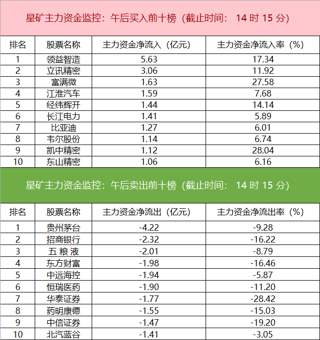 主力资金监控:贵州茅台净卖出超4亿元