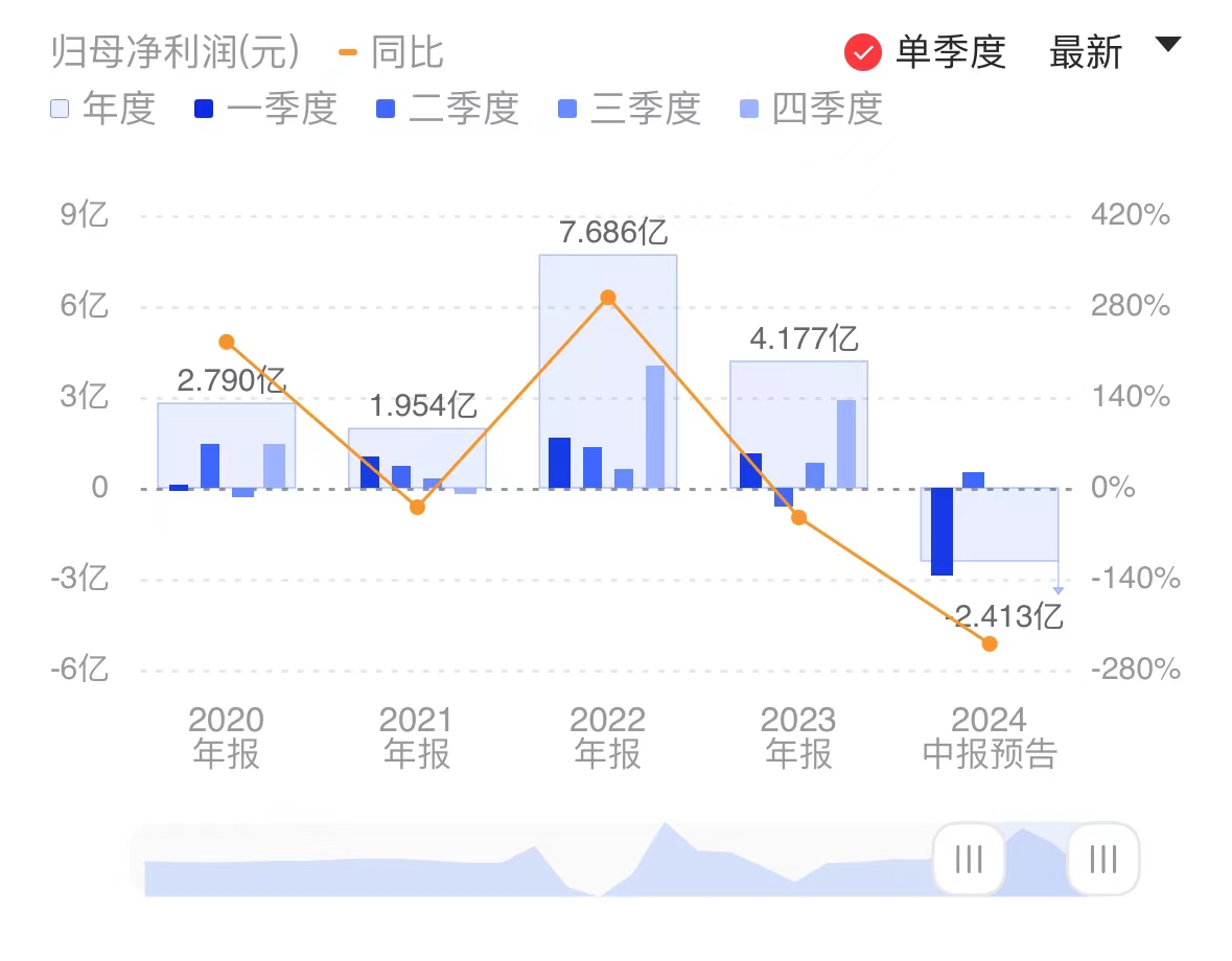 财联社7月8日电,中国稀土公告,预计2024年上半年净利亏损2.31亿元-2.51亿元,上年同期盈利17185.49万元(追溯调整后)。本报告期业绩预告预计数出现亏损的主要原因是:受市场环境、行业供需周期等因素影响,稀土产品价格较上年同期大幅下降,公司按会计准则要求计提存货跌价准备金额较上年同期增加且金额较大。同日公告,公司实际控制人中国稀土集团于2024年7月8日通过集中竞价交易方式增持公司股份500万股,增持金额约1.2亿元,占公司总股本的0.47%。中国稀土集团计划在未来6个月内继续增持公司股份,增持金额不低于2.4亿元,不超过4.8亿元。小财注:Q1净亏损2.89亿元,据此计算,预计Q2净利润为0.38亿元-0.58亿元。