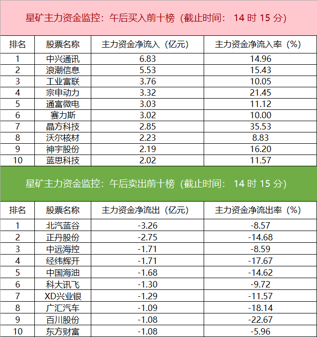 财联社7月9日电,财联社星矿数据显示,今日主力资金净流入电子、半导体、通信等板块,净流出基础化工、银行、医药等板块,其中电子板块净流入59.68亿元。个股方面,中兴通讯大涨,主力资金净买入6.83亿元居首位,浪潮信息、工业富联、宗申动力获主力资金净流入居前;北汽蓝谷遭净卖出3.26亿元居净流出首位,正丹股份、中远海控、经纬辉开等主力资金净流出额居前。