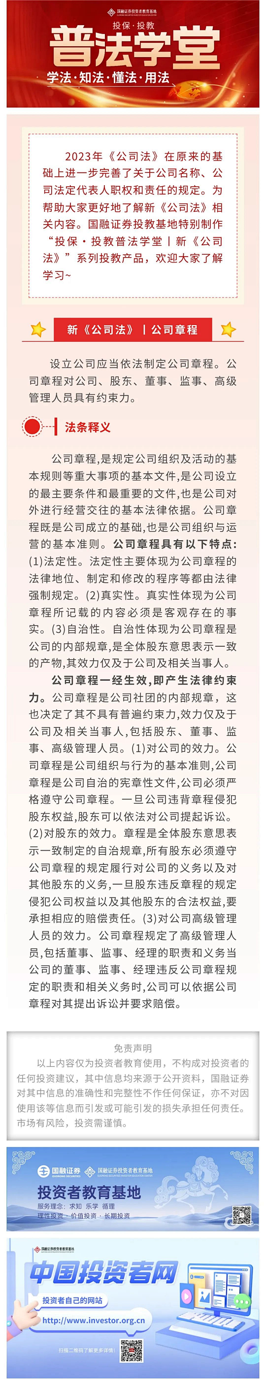 2023年《公司法》在原来的基础上进一步完善了关于公司名称、公司法定代表人职权和责任的规定。为帮助大家更好地了解新《公司法》相关内容。国融证券投教基地特别制作投保·投教普法学堂|新《公司法》”系列投教产品,欢迎大家了解学习~