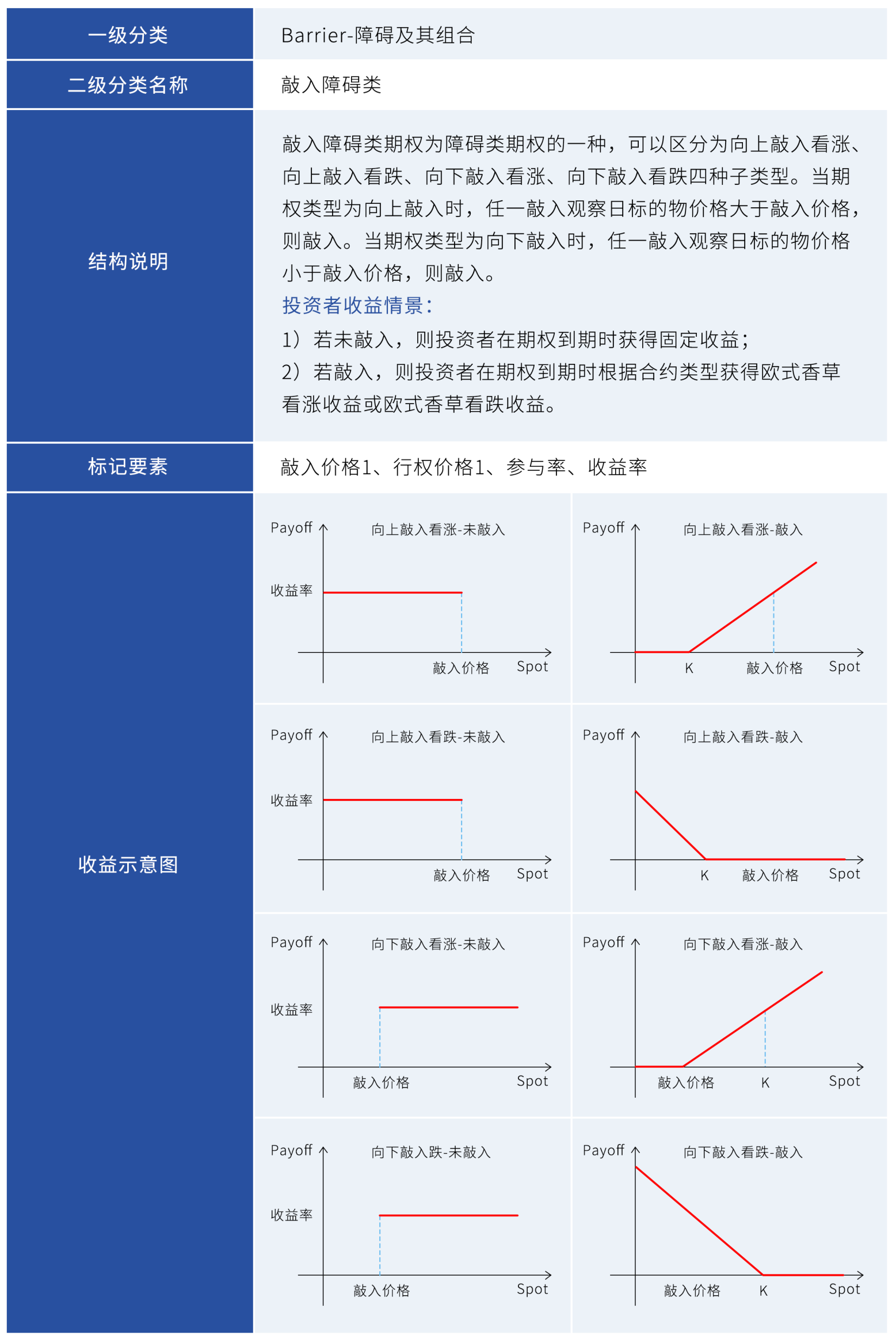 障碍期权分为敲出障碍期权和敲入障碍期权。敲出障碍期权通常指当标的在存续期内从未触碰一个特定的障碍价时,在期末获得等价于香草期权的收益,否则获得固定收益的期权结构。敲入障碍期权通常指当标的在存续期内从未触碰一个特定的障碍价时,在期末获得固定收益,否则在期末获得等价于香草期权的收益的期权结构。
