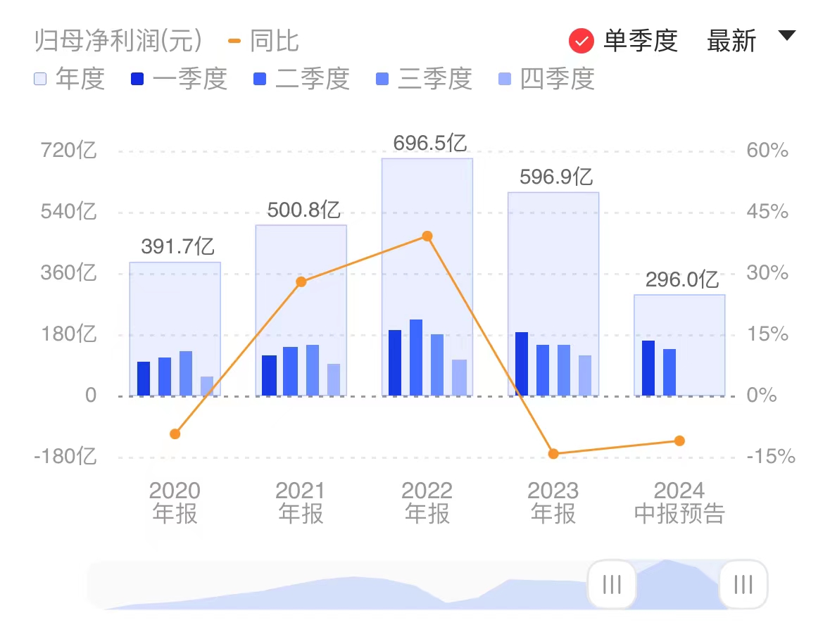 财联社7月9日电,中国神华公告,预计上半年净利润286亿元至306亿元,同比减少27亿元至47亿元,下降8.1%至14.1%。2024年上半年,归属于本公司股东的净利润同比下降,主要是受煤炭平均销售价格下降、燃煤机组平均利用小时数下降等因素的影响。小财注:Q1净利158.84亿元,据此计算,预计Q2净利127亿元-147亿元,环比下降7%-20%。