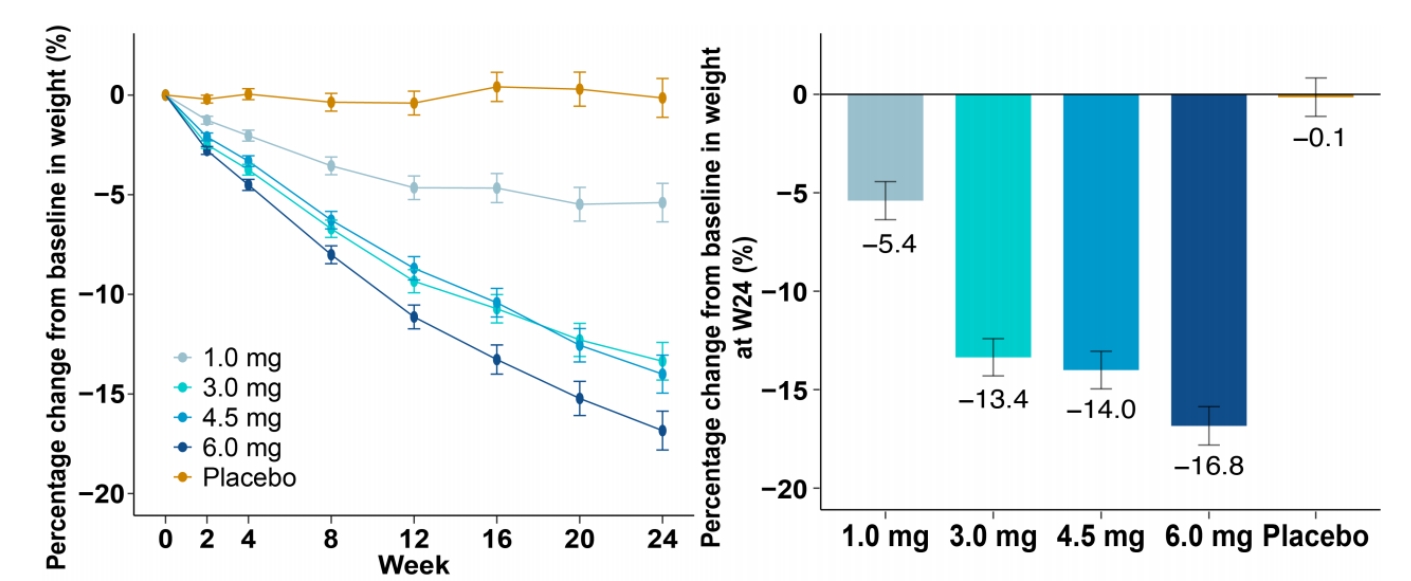 财联社7月13日电,恒瑞医药披露GLP-1/GIP双受体激动剂HRS9531在肥胖成人中的Ⅱ期研究数据,1)治疗24周后,HRS9531从低到高各个剂量组体重自基线分别下降5.4%、13.4%、14.0%、16.8%,安慰剂组仅下降0.1%,各HRS9531组与安慰剂比较P均<0.0001。2)治疗24周后,HRS9531从低到高各个剂量组体重较基线减少≥5%的受试者比例分别为52.0%、88.2%、92.0%和91.8%,安慰剂组仅10.2%。3)HRS9531耐受性良好,大多数不良事件(AE)为轻度或中度,未发现与治疗相关的严重不良事件(SAEs),无受试者因治疗相关不良事件(TRAEs)而停止治疗。该研究结果表明,减重效果基本呈剂量依赖性,同时可以减少腰围,改善血压、甘油三酯和血糖等,且耐受性良好,提示其在肥胖领域有良好的前景。