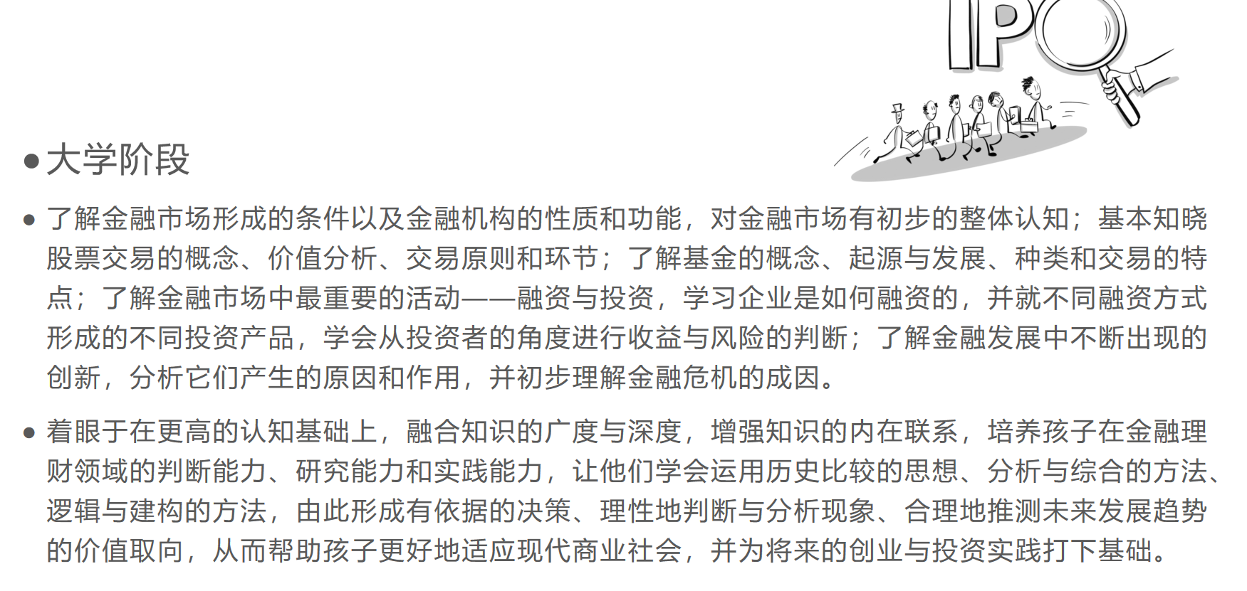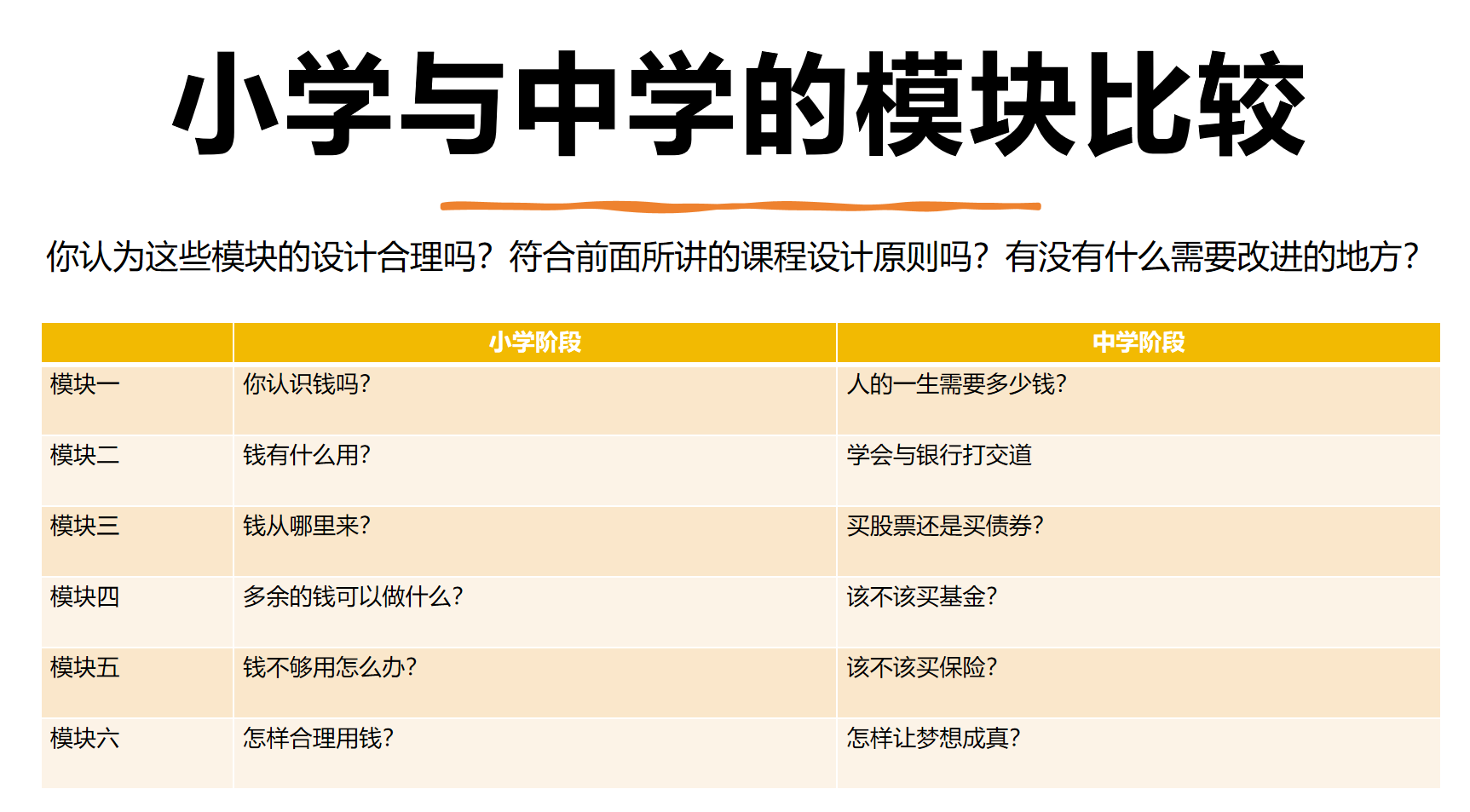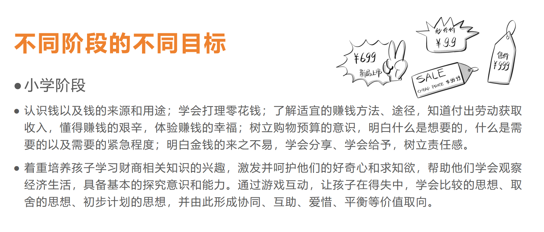 课程的核心在于培养孩子们的金融思维,而不是单纯的灌输知识。针对幼儿园、小学、中学、大学等不同群体,匡老师分别给出了各自的财商课程内容、目标和课程设计方法。