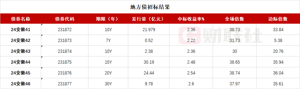 财联社7月16日电,从上交所获悉,安徽省政府六期地方债已招标结束,投标倍数均在30倍之上,具体中标信息如下: