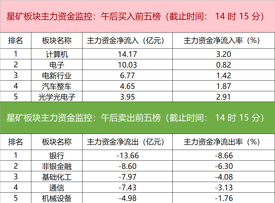 财联社7月16日电,财联社星矿数据显示,今日主力资金净流入计算机、电子、电新行业等板块,净流出银行、非银金融、基础化工等板块,其中计算机板块净流入14.17亿元。个股方面,紫光股份涨停,主力资金净买入8.70亿元居首位,欣旺达、长安汽车、浪潮信息获主力资金净流入居前;中国平安遭净卖出5.52亿元居净流出首位,中际旭创、赛力斯、工商银行等主力资金净流出额居前。
