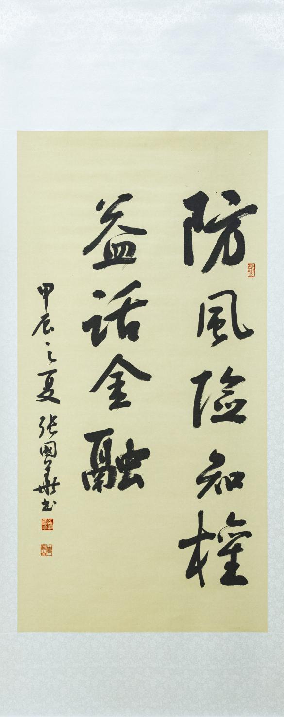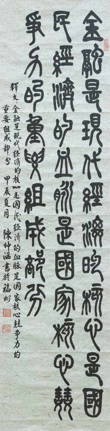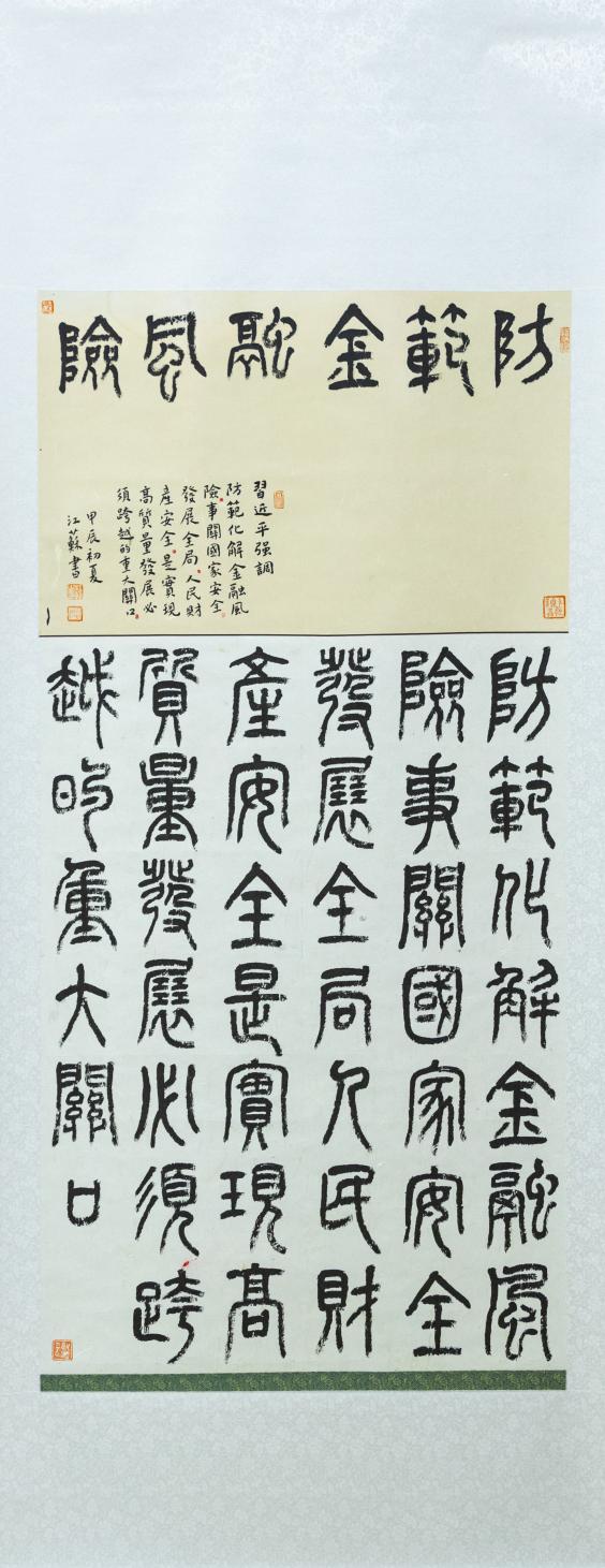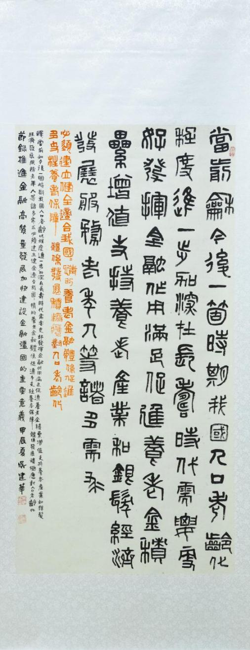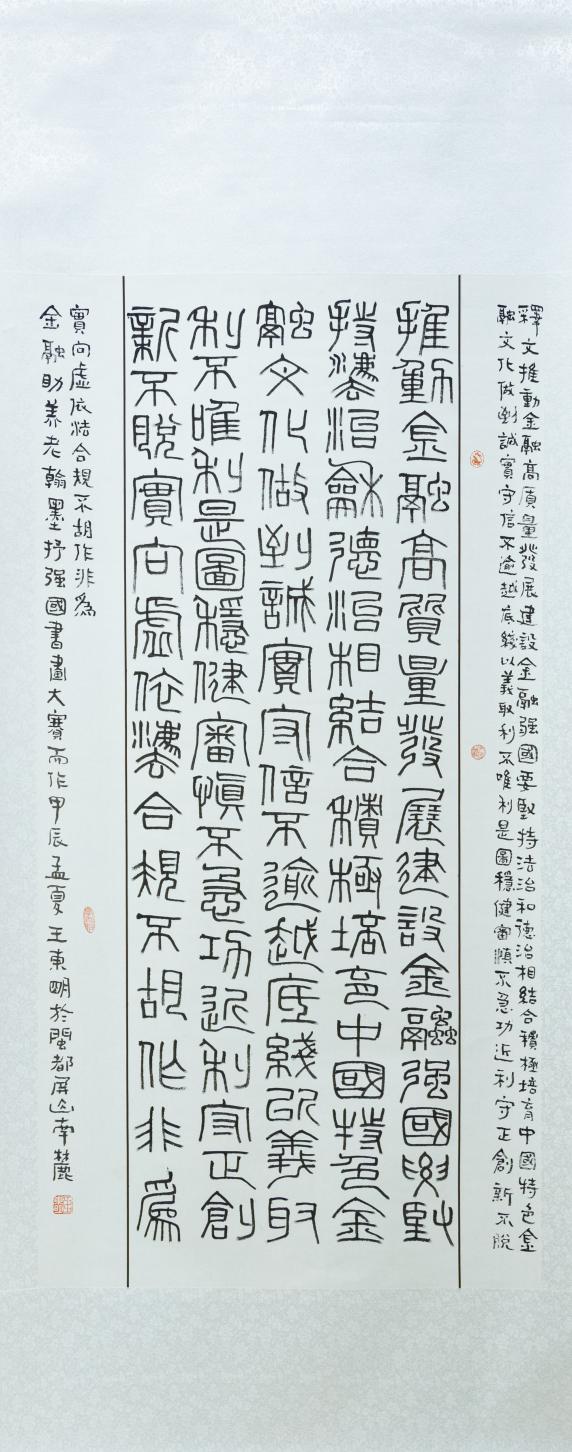 亮点解读:该作品以篆书为内容主体,隶书作落款,主次分明,再辅以多枚印章调节,使章法更加生动有趣。