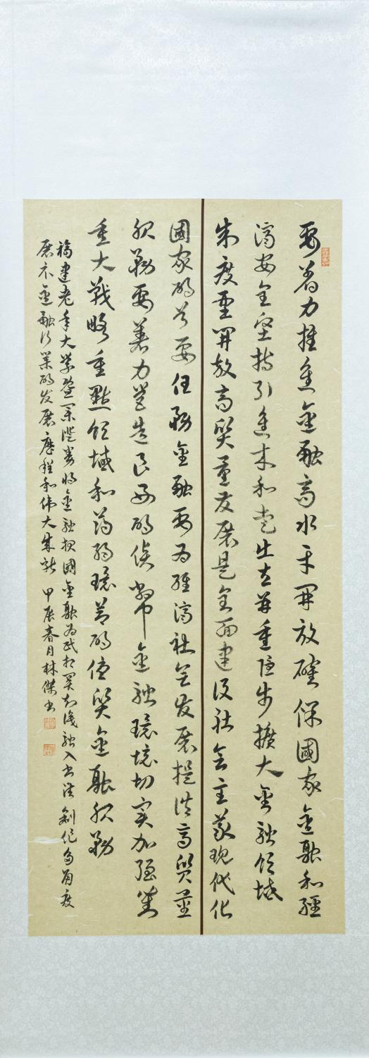 亮点解读:该作品以对联的形式创作,主题内容和说明的文字安排主次分明,为活跃章法,在落款小字上,稍微错落,可见作者布局匠心。