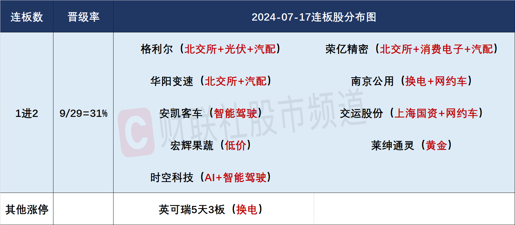 今日共33股涨停,连板股总数9只,上一交易日共33只个股涨停,涨停股晋级率27.27%(不含ST股、退市股及未开板新股)。个股方面,全市场超3500只个股下跌,北交所个股继续爆发,日内一度有百股涨超10%,共9只北交所个股30CM涨停,其中华阳变速、格利尔、荣亿精密30CM2连板。连板方面,锦江在线尾盘炸板未能封死涨停,市场连板高度仅剩2板,为今年以来首次。板块方面,受上海市国资委7月16日下午召开市值管理工作座谈会消息刺激,上海国企改革概念股盘中走强,长江投资、外服控股、开开实业等个股涨停。市场整体呈现高低切换态势,高位的CPO、消费电子、PCB、电网设备等板块集体大跌,沪电股份逼近跌停,胜宏科技、工业富联等跌超5%,低位的白酒、光伏板块反弹,顺鑫农业、迎驾贡酒等涨超5%。