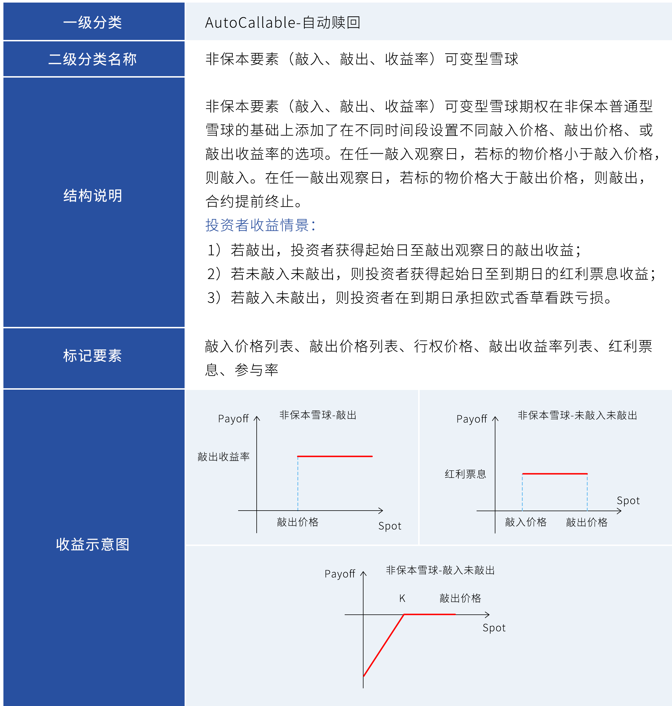 自动赎回结构属于路径依赖的自动可赎回期权结构,即标的资产价格波动决定了该期权是否终止、是否会触发一个新的合约以及得到多少收益。与障碍期权类似,其存续期内往往包含敲入事件、敲出事件或两者均包含。敲入事件通常会触发一个新的合约,如香草期权、香草价差期权等;敲出事件一般意味着该期权提前终止。自动赎回结构与普通障碍期权的区别主要体现在,发生敲出时,自动赎回结构即获得收益并终止。