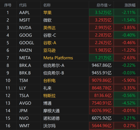 美股科技巨头集体黯然失色 市值排名前10股票无一上涨