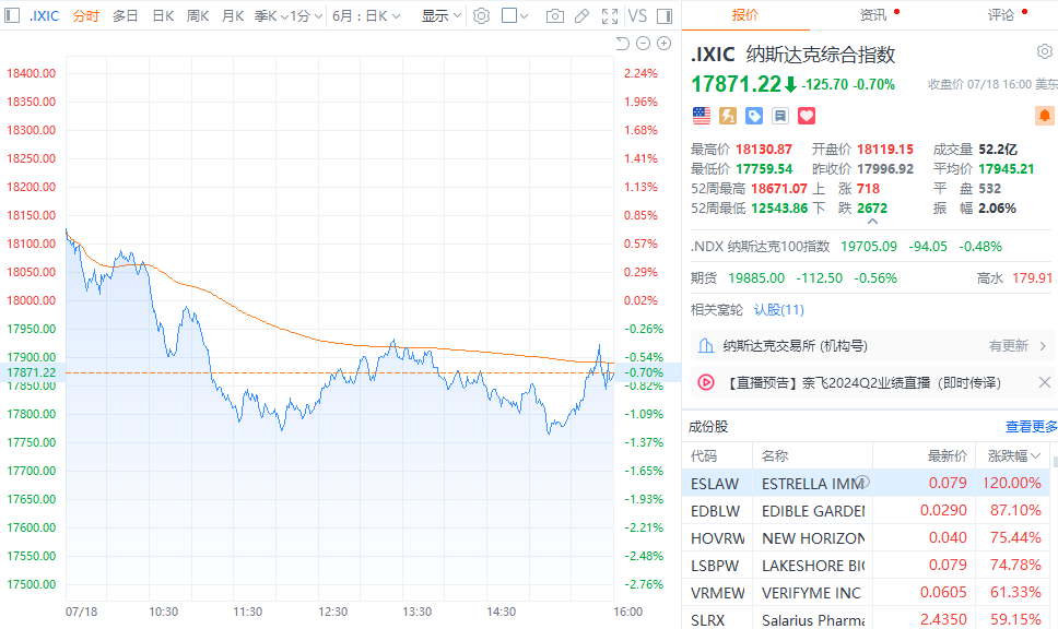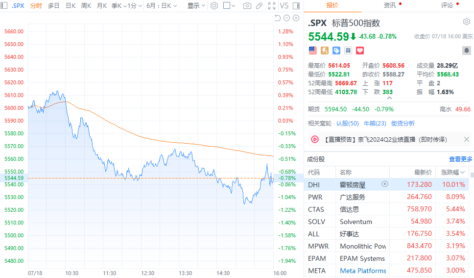 财联社7月19日电,美股三大指数集体收跌,道指跌1.29%,标普500指数跌0.78%,纳指跌0.7%。其中,道指终结日线六连涨。大型科技股多数下跌,亚马逊、苹果跌超2%,谷歌跌超1%,奈飞、微软小幅下跌;META涨超3%,英伟达涨超2%,特斯拉小幅上涨。Beyond Meat跌逾10%,公司此前与债券持有人讨论资产负债表重组。