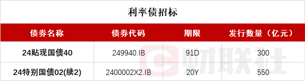 财联社7月19日电,按照此前公布的发行计划,财政部将于上午10:35-11:35招标发行两期国债,分别为:2024年记账式贴现(四十期)国债,期限91D,发行量不超过300亿元;2024年超长期特别国债(二期)(第二次续发),期限20年,发行量不超过550亿元,票面利率2.49%。