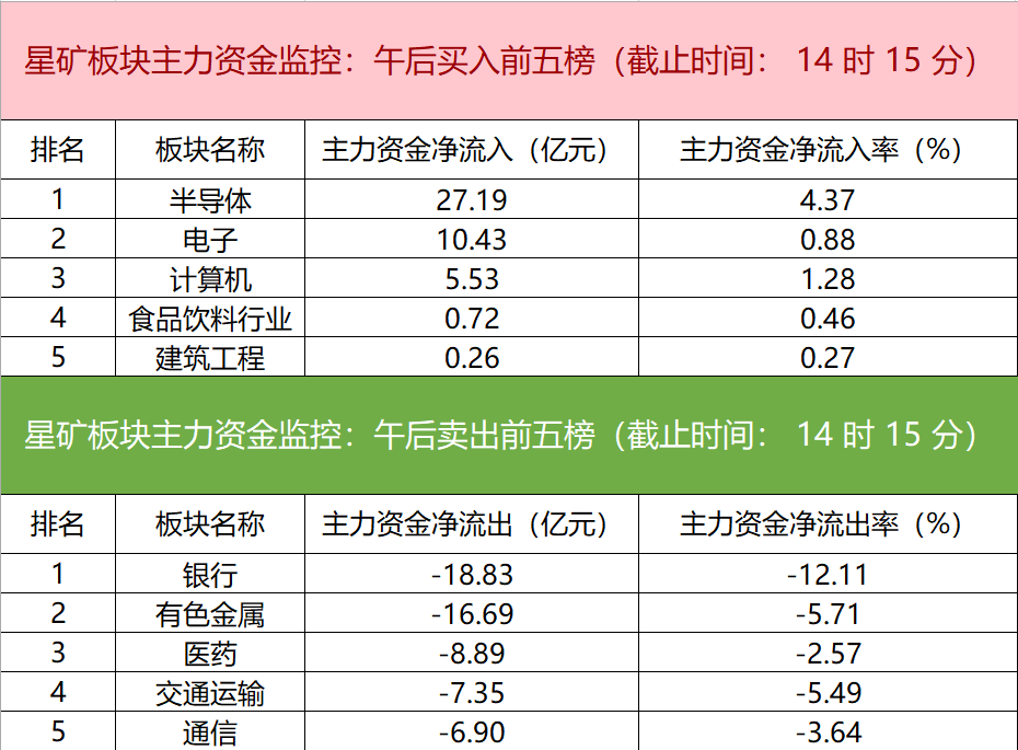 财联社7月19日电,财联社星矿数据显示,今日主力资金净流入半导体、电子、计算机等板块,净流出银行、有色金属、医药等板块,其中半导体板块净流入27.19亿元。个股方面,士兰微涨停,主力资金净买入4.70亿元居首位,中芯国际、上海贝岭、高新发展获主力资金净流入居前;北汽蓝谷遭净卖出3.81亿元居净流出首位,工商银行、紫金矿业、工业富联等主力资金净流出额居前。