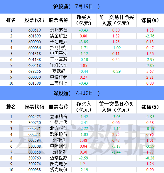 财联社7月19日电,北向资金今日大幅净卖出59.79亿元。长江电力、迈瑞医疗、宁德时代分别遭净卖出3.85亿元、2.59亿元、2.41亿元。江淮汽车净买入额居首,金额为4.05亿元。