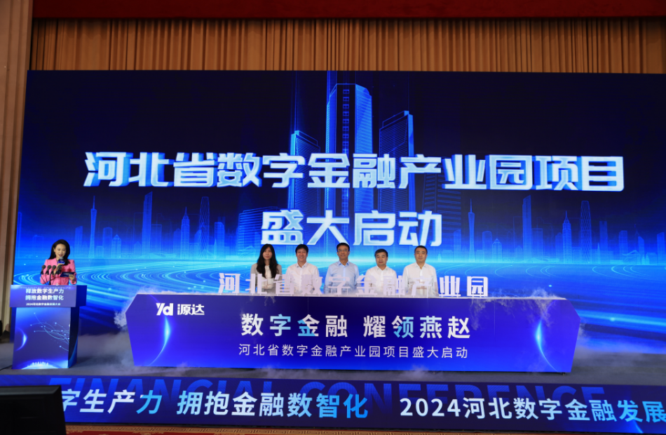 主旨演讲结束后,吴显国、李红录、刘中林、郝旭、河北源达信息技术股份有限公司总裁程然在参会嘉宾的见证下共同启动“河北省数字金融产业园”项目。