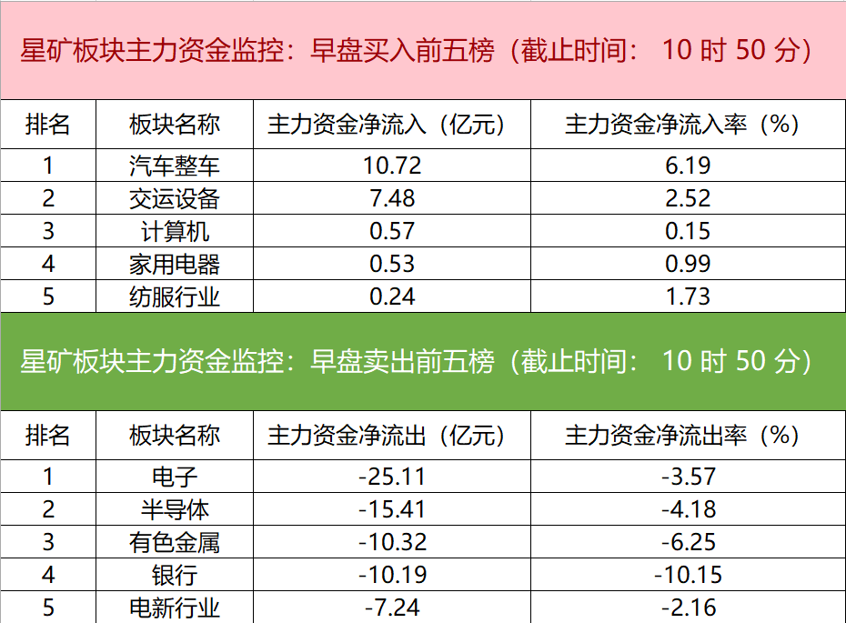 财联社7月22日电,财联社星矿数据显示,今日早盘主力资金净流入汽车整车、交运设备、计算机等板块,净流出电子、半导体、有色金属等板块,其中电子板块净流出超25亿元。个股方面,赛力斯大涨,主力资金净买入3.85亿元位居首位,北汽蓝谷、长安汽车、正丹股份获主力资金净流入居前;中信证券遭净卖出超5亿元,招商银行、士兰微、贵州茅台主力资金净流出额居前。