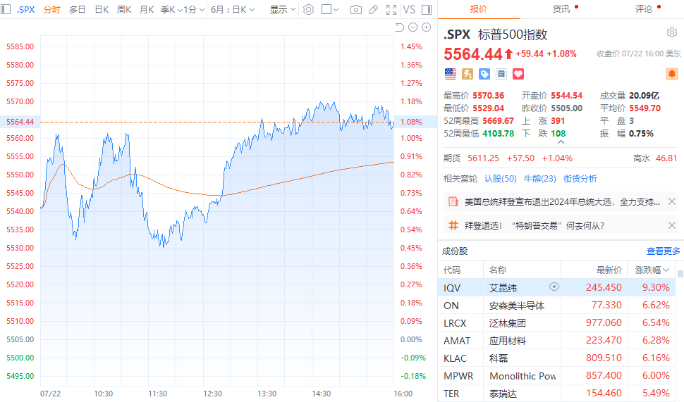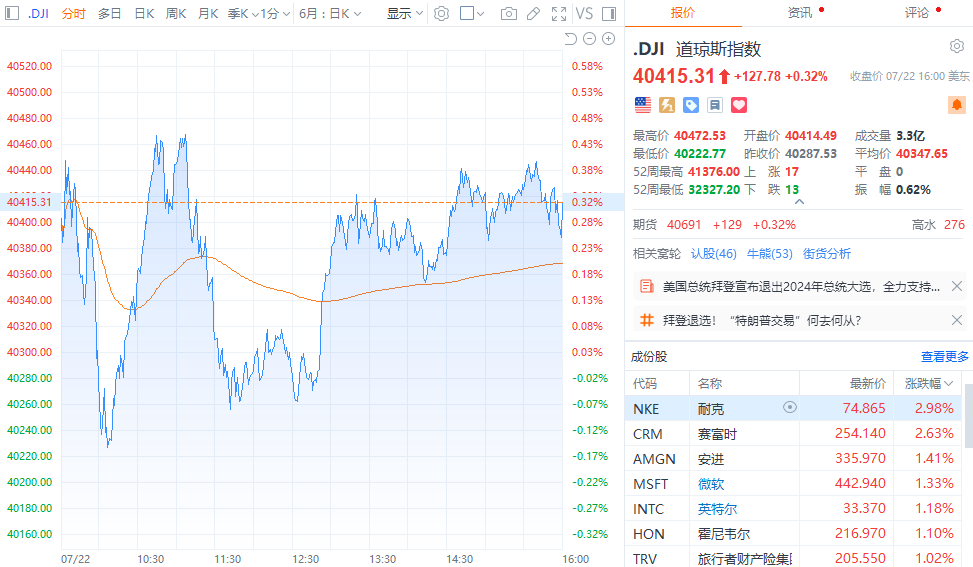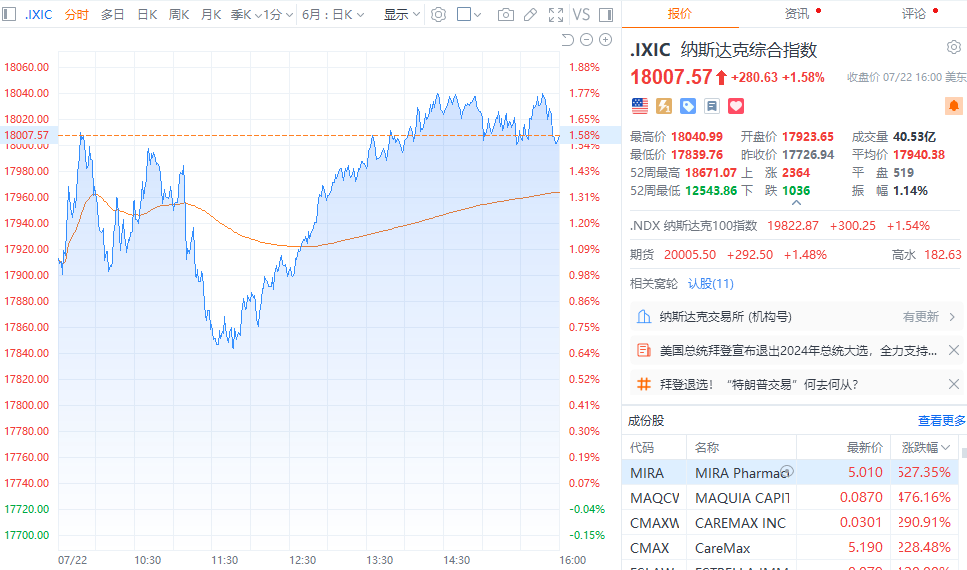 美股三大指数集体收涨 纳指、标普500指数涨超1%