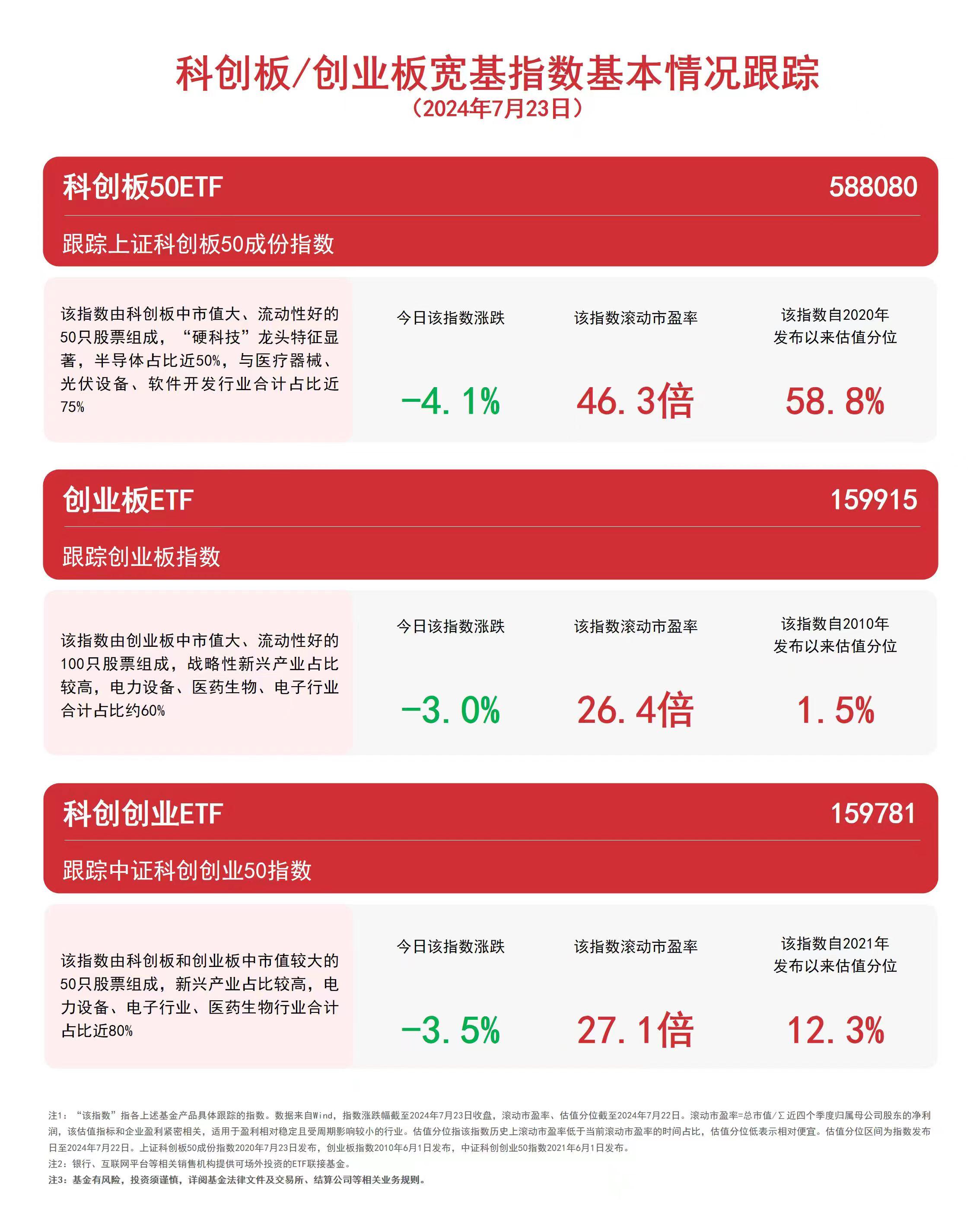 财联社7月23日电,截至收盘,今日创业板指数下跌3.0%,中证科创创业50指数下跌3.5%,上证科创板50成份指数下跌4.1%。