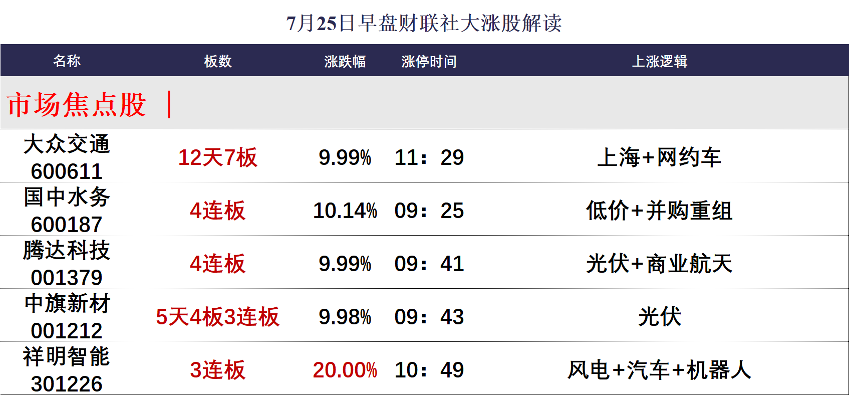 财联社7月25日电,今日午盘两市共40股涨停,连板股总数7只,9股封板未遂,封板率为82%(不含ST股、退市股及未开板新股)。焦点股方面,大众交通12天7板激活无人驾驶网约车板块,金龙汽车10天5板、江西长运8天4板;新能源赛道集体大涨,中旗新材5天4板、祥明智能创业板3连板。