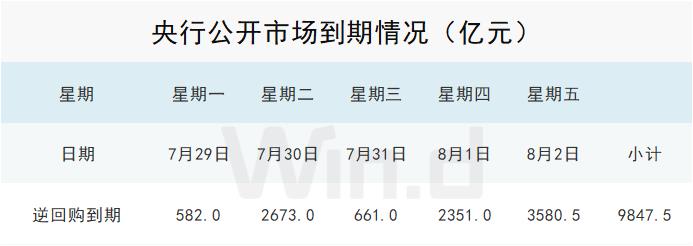 财联社7月26日电,Wind数据显示,下周(7月27日至8月2日)央行公开市场将有9847.5亿元逆回购到期,其中周一至周五分别到期582亿元、2673亿元、661亿元、2351亿元、3580.5亿元。