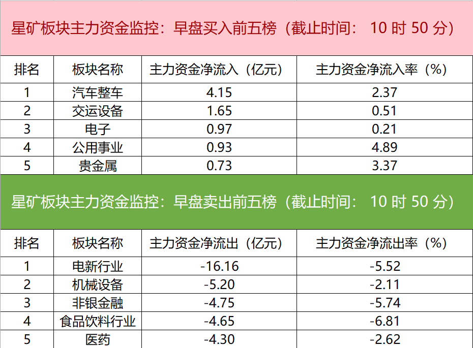 财联社7月29日电,财联社星矿数据显示,今日早盘主力资金净流入汽车整车、交运设备、电子等板块,净流出电新行业、机械设备、非银金融等板块,其中电新行业净流出超16亿元。个股方面,赛力斯大涨,主力资金净买入2.85亿元位居首位,金溢科技、罗博特科、锦江在线获主力资金净流入居前;宁德时代遭净卖出超4亿元,北汽蓝谷、潍柴动力、寒武纪主力资金净流出额居前。