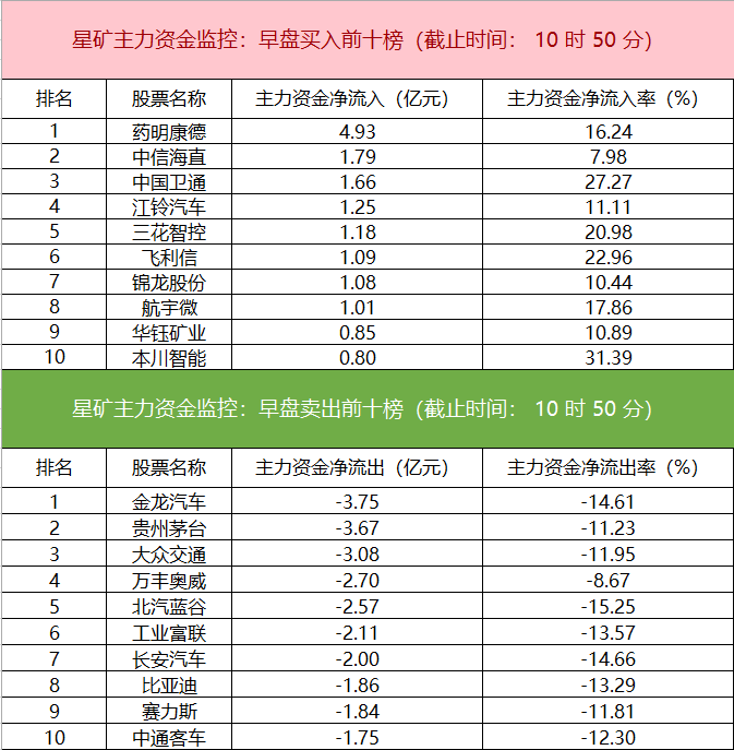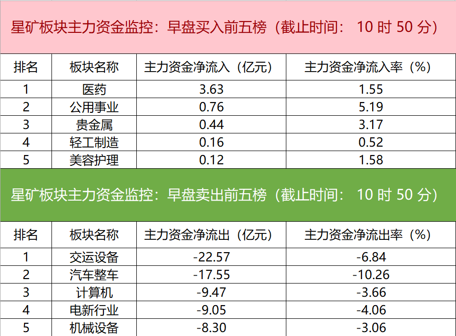 财联社7月30日电,财联社星矿数据显示,今日早盘主力资金净流入医药、公用事业、贵金属等板块,净流出交运设备、汽车整车、计算机等板块,其中交运设备板块净流出超22亿元。个股方面,药明康德大涨,主力资金净买入4.93亿元位居首位,中信海直、中国卫通、江铃汽车获主力资金净流入居前;金龙汽车遭净卖出超3亿元,贵州茅台、大众交通、万丰奥威主力资金净流出额居前。