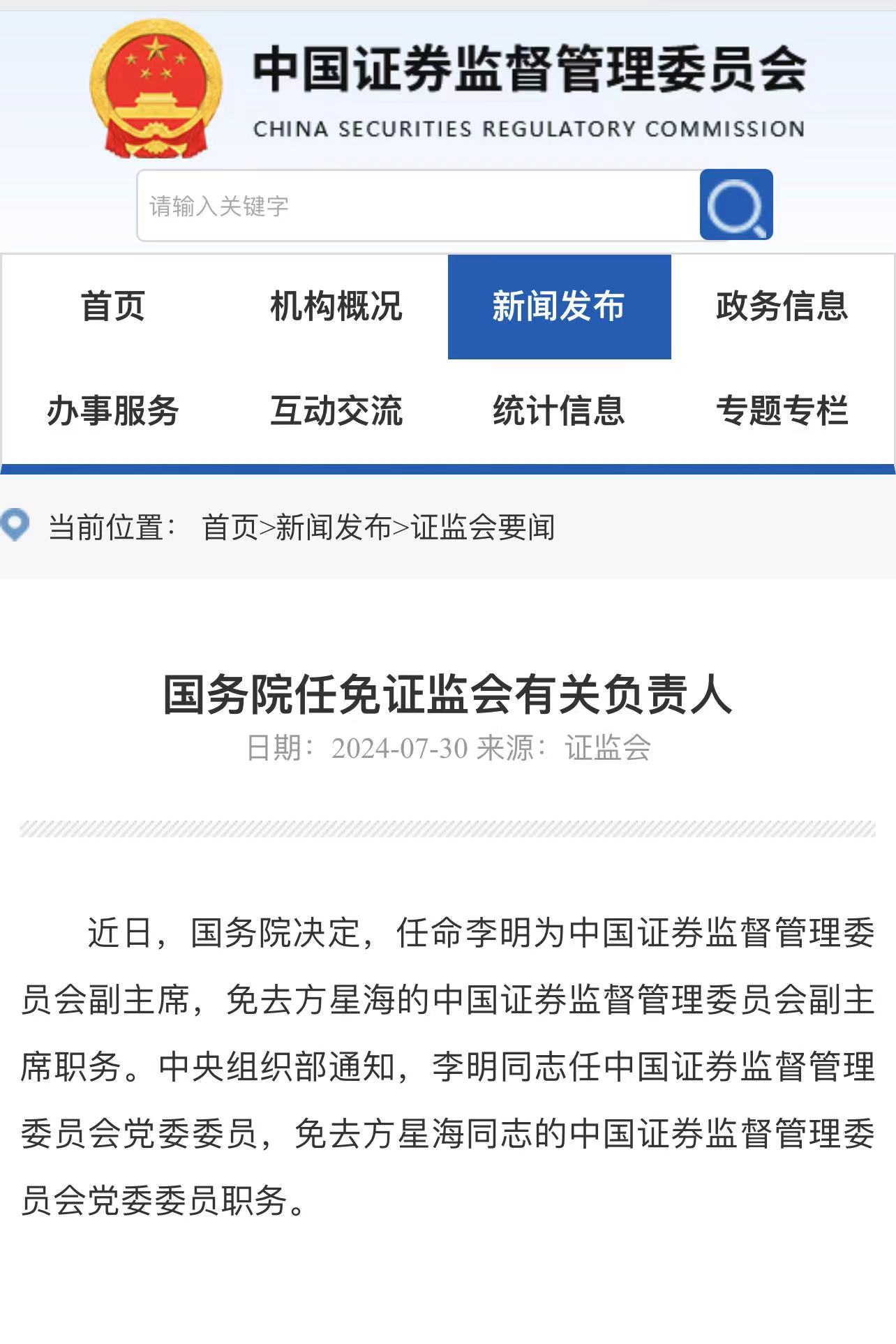 财联社7月30日电,国务院决定,任命李明为中国证券监督管理委员会副主席,免去方星海的中国证券监督管理委员会副主席职务。中央组织部通知,李明同志任中国证券监督管理委员会党委委员,免去方星海同志的中国证券监督管理委员会党委委员职务。